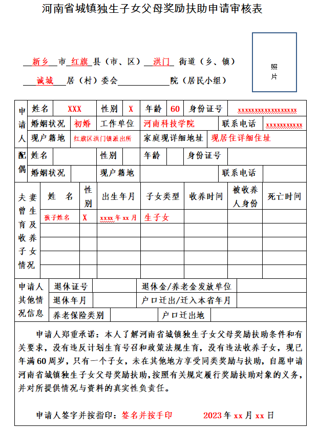 1.河南省城镇独生子女父母奖励扶助申请审核表2份(须手写,不得复印);
