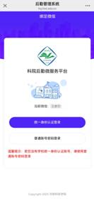 第二步:关注“科院后勤微服务”微信公众号后,点击下方菜单中的“绑定微信”,在显示页面中点击“统一身份认证登录”,而后选择“账号登录”并按照提示输入“工号/学号”和“密码”登录。若忘记密码,请按照统一身份认证平台忘记密码操作手册要求操作。