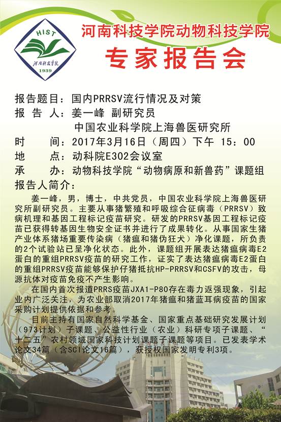 姜一峰,男,博士,中共党员,中国农业科学院上海兽医研究所副研究员。主要从事猪繁殖和呼吸综合征病毒(PRRSV)致病机理和基因工程标记疫苗研究。研发的PRRSV基因工程标记疫苗已获得转基因生物安全证书并进行了成果转化。从事国家生猪产业体系猪场重要传染病(猪瘟和猪伪狂犬)净化课题,所负责的2个试验站已呈净化状态。此外,课题组开展表达猪瘟病毒E2蛋白的重组PRRSV疫苗的研究工作,证实了表达猪瘟病毒E2蛋白的重组PRRSV疫苗能够保护仔猪抵抗HP-PRRSV和CSFV的攻击,母源抗体对疫苗免疫不产生影响。