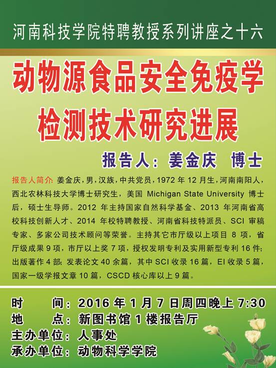 特聘教授系列讲座之十六:动物源食品安全免疫学检测技术研究进展