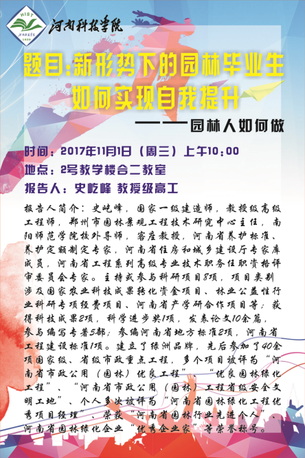 报告人简介:史屹峰,国家一级建造师,教授级高级工程师,郑州市园林景观工程技术研究中心主任,南阳师范学院校外导师,客座教授,河南省养护标准、养护定额制定专家,河南省住房和城乡建设厅专家库成员,河南省工程系列高级专业技术职务任职资格评审委员会专家。主持或参与科研项目8项,项目类别涉及国家农业科技成果转化资金项目、林业公益性行业科研专项经费项目、河南省产学研合作项目等;获得科技成果2项,科学进步奖1项,发表论文10余篇,参与编写专著5部;参编河南省地方标准2项,河南省工程建设标准1项。建立了绿洲品牌,先后参加了40余项国家级、省级市政重点工程,多个项目被评为“河南省市政公用(园林)优良工程”、“优良园林绿化工程”、 “河南省市政公用(园林)工程省级安全文明工地”、个人多次被评为“河南省园林绿化工程优秀项目经理”、荣获“河南省园林行业先进个人”、 河南省园林绿化企业“优秀企业家”等荣誉称号。