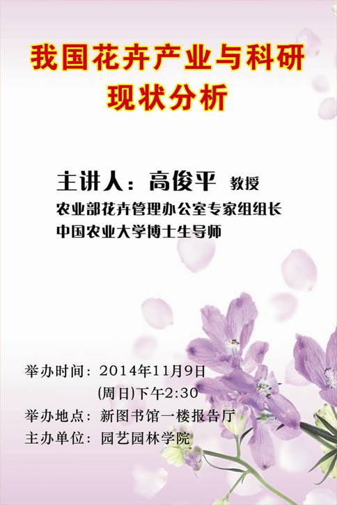 高俊平个人简介:中国农业大学观赏园艺与园林系教授,系主任,博士生导师。中国园艺学会理事,农业部农作物品种审定委员会花卉专业委员会组长,农业部首届植物新品种复审委员会花卉牧草组组长,《园艺学报》编委。