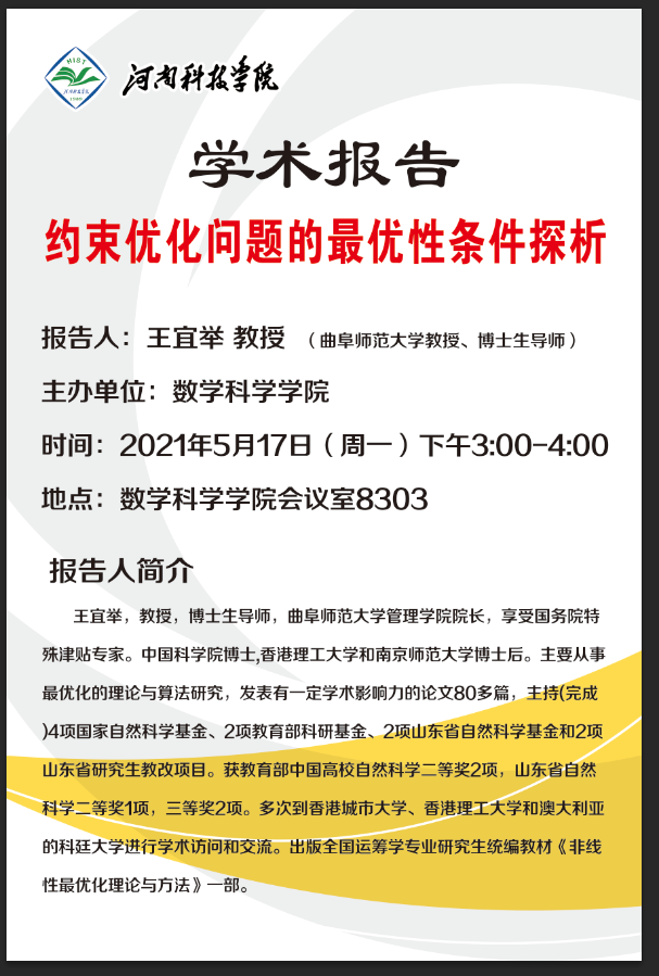 报告人简介:王宜举,教授,博士生导师,曲阜师范大学管理学院院长,享受国务院特殊津贴专家。中国科学院博士,香港理工大学和南京师范大学博士后。主要从事最优化的理论与算法研究,发表有一定学术影响力的论文80多篇,主持(完成)4项国家自然科学基金、2项教育部科研基金、2项山东省自然科学基金和2项山东省研究生教改项目。获教育部中国高校自然科学二等奖2项,山东省自然科学二等奖1项,三等奖2项。多次到香港城市大学、香港理工大学和澳大利亚的科廷大学进行学术访问和交流。出版全国运筹学专业研究生统编教材《非线性最优化理论与方法》一部。