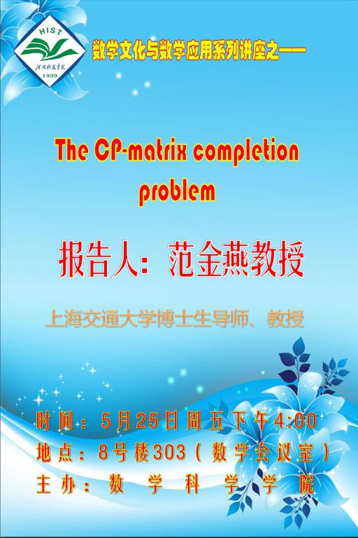 报告人简介:范金燕,上海交通大学数学科学学院博士生导师、教授。2002年在中国科学院数学与系统科学研究院获理学博士学位。主要从事非线性最优化的理论和方法研究,在非线性方程组和完全正优化研究领域取得了一系列重要成果,相关论文发表在Math. Program.、SIAM J. Matrix Anal. Appl.、Math. Comp.等国际期刊上,出版了专著《非线性方程组数值方法》。主持国家自然科学基金项目4项。现为J. Ind. Manag. Optim.、J. Oper. Res. Soc. China、《计算数学》等学术期刊的编委。2017年获“第十三届中国青年女科学家奖”。