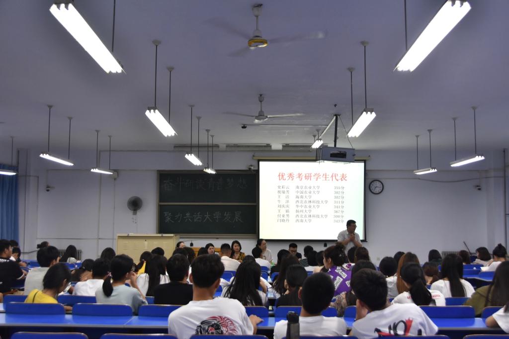 会上,教师代表和考研优秀学生代表分别介绍考研心得和体会,并结合考研经历详细地讲解了备考前期的准备工作和备考期间应注意的事项,包括考研信心的树立以及心态的调整、考研计划的制定与实施、作息时间的安排、备考期间的学习方法和学习技巧等问题,分享了如何选择学校与专业等方面的一些经验。