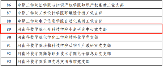 生命科技学院小麦研究中心党支部始终坚持以习近平新时代中国特色社会主义思想为指导,承载新时代高校“为党育人、为国育才”的初心使命,牢固树立“四个意识”、坚定“四个自信”、坚决做到“两个维护”,曾荣获“第25届河南青年五四奖章集体”“国家高等学校黄大年式教师团队”“农业部小麦育种优秀科研创新团队”等多项荣誉称号,小麦研究中心党支部连续4年被评为河南科技学院“先进党支部”。
