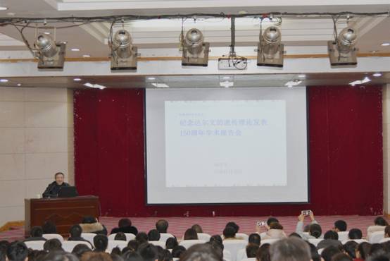 12月13日下午,我院在图教201举行了学术报告会,邀请我校特聘教授、我院教师刘用生做了题为“纪念达尔文遗传理论发表150周年”的学术报告,人事处处长宋飞琼教授、茹振钢教授等部分教师、研究生和本科生200余人参加了报告会,报告会由生命科技学院院长刘明久主持。