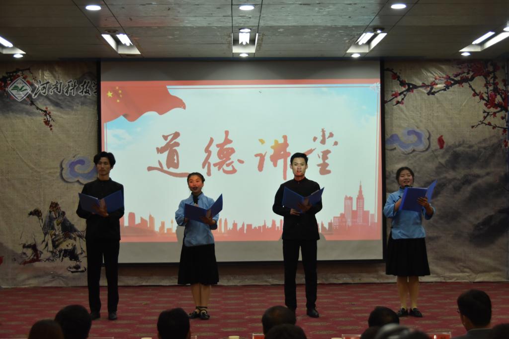 4月30日晚,由校文明办主办,生命科技学院承办的第七十五期道德讲堂在图教201举行。党的十九大代表、中原学者、小麦育种专家茹振刚,校党委宣传部副部长方强,校党委学工部、学生处副处长陈利,校团委副书记袁博以及生命科技学院党委书记余鹏、院长刘明久、团委书记李鹏、辅导员王新生老师和学生代表300余人参加了活动。