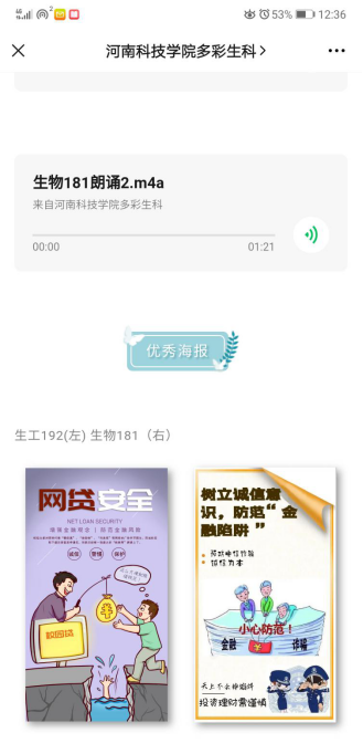 围绕诚信、金融安全知识,我院在全体在校生中进行“树立诚信观念防范金融风险”主题作品征集,形式有电子海报、手抄报、朗读、歌曲视频等,内容涉及预防金融诈骗小知识、诚信贷款与还款、资助感恩征文等。此次活动共征集作品40余篇,通过评比,我院选出优秀作品进行线上展示,其中“树立诚信观念防范金融风险”主题微信文案被推荐到学校参加比赛,荣获“树立诚信观念防范金融风险”二等奖。此次活动不仅向同学们宣传了金融知识,同时还帮助同学们树立了诚信意识和感恩意识。