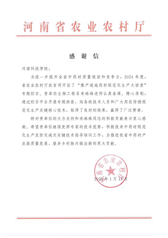 省农业农村厅经济作物办公室于2024年7月起举办“豫产道地药材规范化生产大讲堂”活动,旨在通过各不同领域经济作物专家的精心讲解,借助于网络平台,对河南省豫产道地药材品种进行宣传,推广其规范化种植技术,提高广大农民和企业的种植积极性,并提供合理、科学、高效、生态种植方式和方法。生命科学学院宋琳琳老师在豫产道地药材规范化生产大讲堂第6期《野菊花驯化栽培技术》的讲解深入浅出,获得广泛好评,并获省农业农村厅致信感谢。