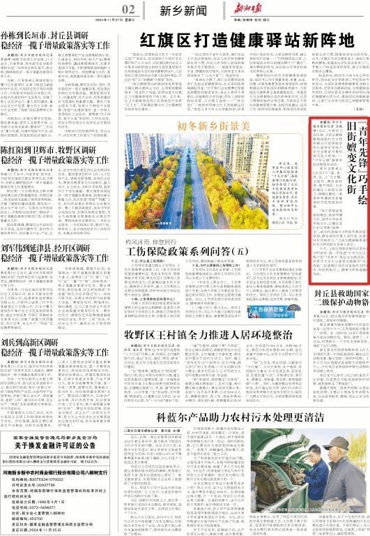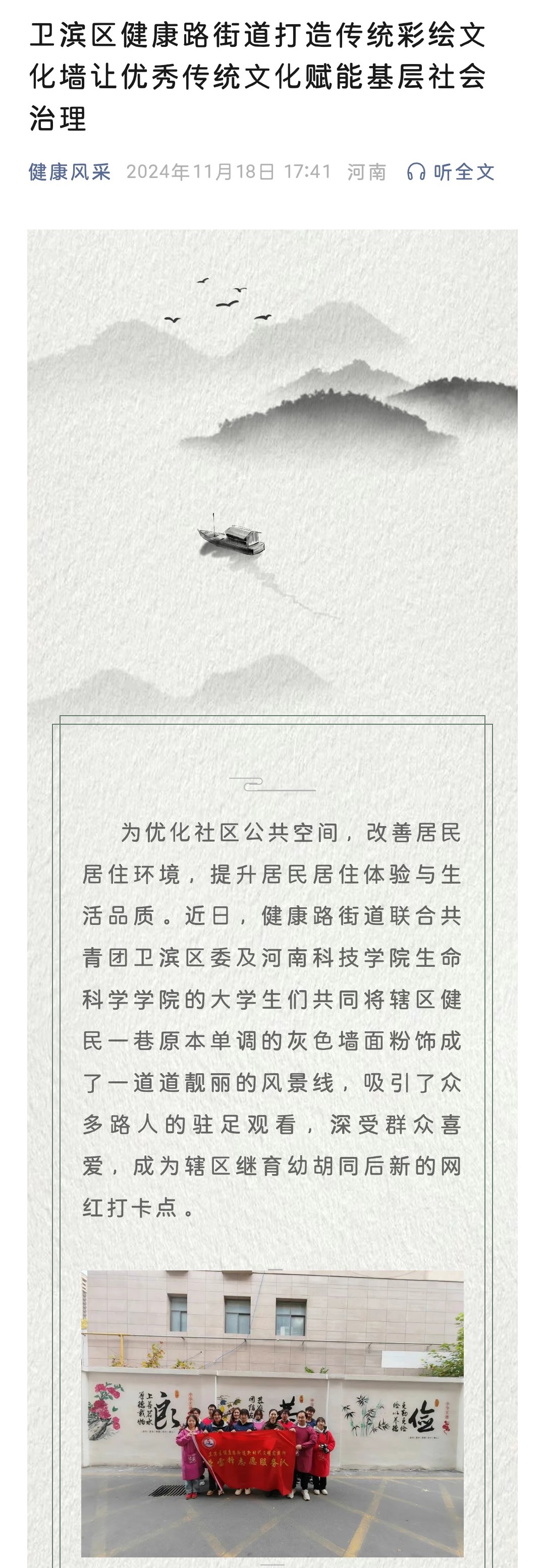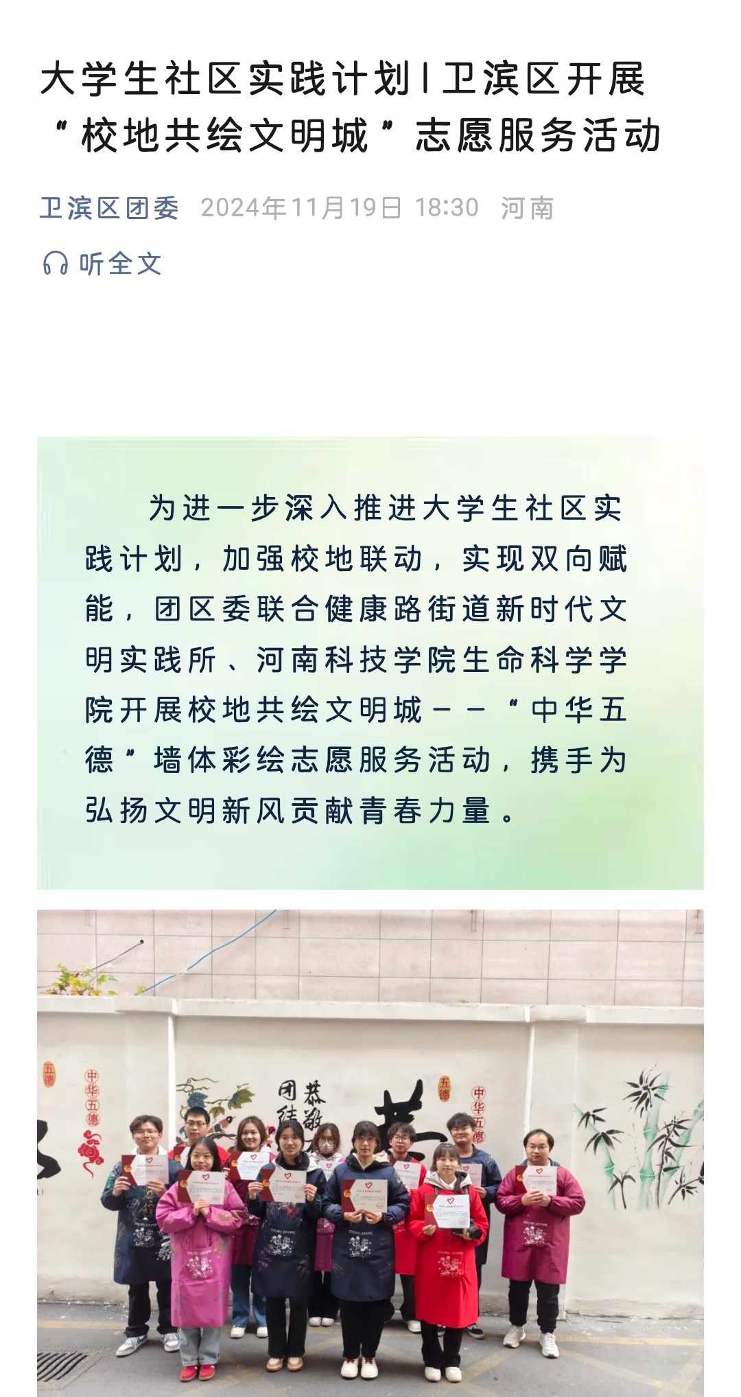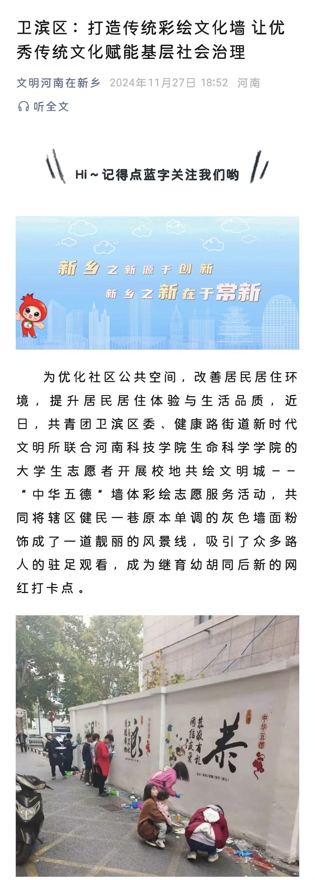 11月16日至17日,生命科学学院“绘绿水青山,筑环保意识”实践团携手河南科技学院青年志愿者联合会,在河南省新乡市卫滨区人民政府旁举办了一场别开生面的“涂美社区,绘梦先锋”墙绘活动。新乡日报、卫滨区团委等媒体和公众号平台对该活动进行报道。