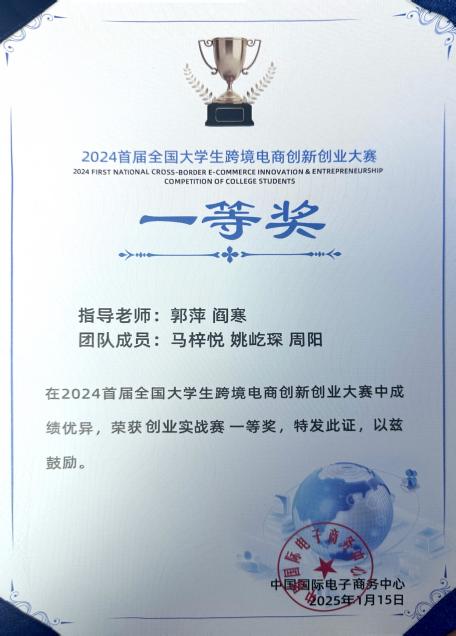 我校经济与管理学院和国际教育学院硕士研究生在由国家商务部主办、阿里巴巴承办的首届全国大学生跨境电商创新创业大赛中取得优异成绩。2025年1月15日,我校硕士研究生在激烈的竞争中脱颖而出,展现了经济与管理学院学子的风采。本届大赛围绕“营销获客、商机转化、订单履约”跨境电商经营核心环节,通过模拟经营、方案创新和实战比拼,旨在培养跨境电商领域的创新实战人才,带动大学生在跨境电商领域创业与就业。大赛规模宏大,吸引了全国524所高校报名,共计3225支参赛队伍、超1万名师生参与其中。经过初赛角逐、复赛比拼,最终仅十几支队伍进入决赛阶段。在中央财经大学举办的决赛现场上,由经管学院郭萍老师和阎寒老师指导的国际商务研究生马梓悦、姚屹琛、YANICK(国教学院)组成的队伍,凭借出色的专业技能和极具创意的方案,取得了一等奖的好成绩。此外,由郭萍老师和张红岩老师指导的国际商务研究生董艳茹组成的队伍在比赛中荣获国赛优秀奖。本次参赛过程得到了2012级国际经济与贸易专业优秀校友邢帅所创办的科南起重机械有限公司和新乡市三圆堂机械实践平台的友情助力。 这些优异成绩充分彰显了我校学生在跨境电商创新创业领域扎实的专业功底,以及他们在实践和创新方面的出色能力。此次大赛为我校学生提供了一个展示自我的平台,也激励着更多学子在创新创业的道路上砥砺前行。未来,我校将继续秉持对学生创新创业能力培养的重视,鼓励学生积极参与各类高水平竞赛,进一步提升学生的综合素养和竞争力,为电商行业的发展输送更多优秀人才。