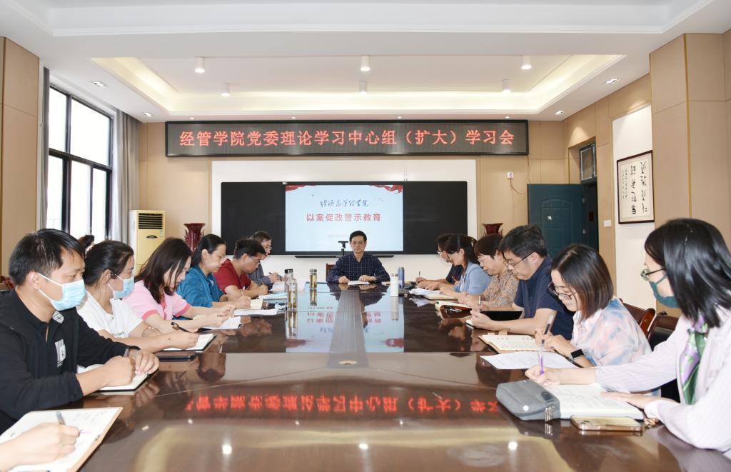9月29日下午,在10#202会议室,经济与管理学院召开党委理论学习中心组(扩大)学习会,专题开展以案促改、警示教育。学院领导班子成员、党委委员、正科级以上干部参加会议,副院长郎群秀主持会议。