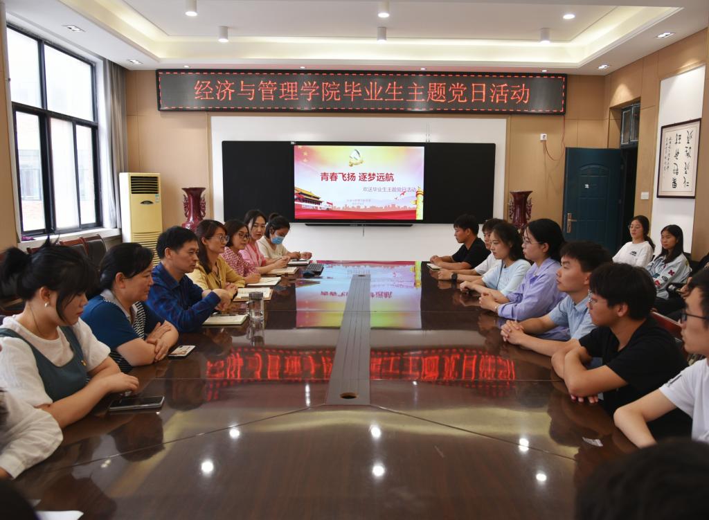 6月5日下午,经济与管理学院在10号楼202室开展“青春飞扬 逐梦远航”毕业生主题党日活动。学院党委书记何二毛,党委副书记吴丹,副院长张红岩,全体辅导员及毕业生党员代表30余人参加活动。