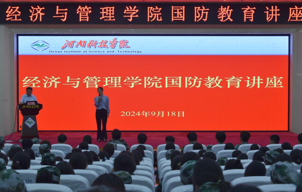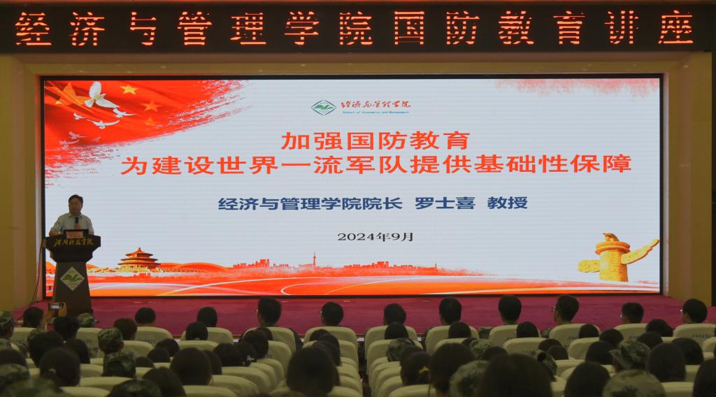 9月18日下午,经济与管理学院在办公楼308报告厅举办国防教育讲座。本次讲座由学院院长罗士喜教授主讲。学院党委书记何二毛、党委副书记吴丹、全体辅导员及2024级新生等300余人参加讲座。
