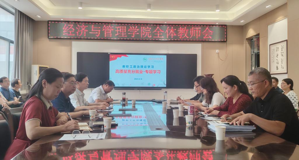 6月6日下午,经济与管理学院在10号楼202会议室召开全体教师会,围绕“高质量充分就业”进行专题学习和部署。院党委书记何二毛主持会议