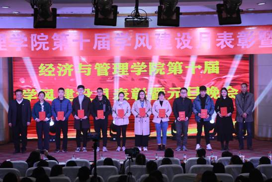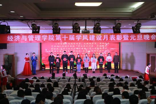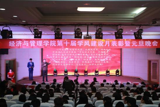 为深入贯彻落实“不忘初心、牢记使命”主题教育,进一步推进学院学风建设,12月14日晚,经济与管理学院在老图书馆201报告厅举行了第十届学风建设表彰大会暨元旦联欢晚会。校团委书记于江傲、学生处副处长郭超杰以及经济与管理学院负责人、受表彰的先进个人和学生代表400余人参加了表彰大会。