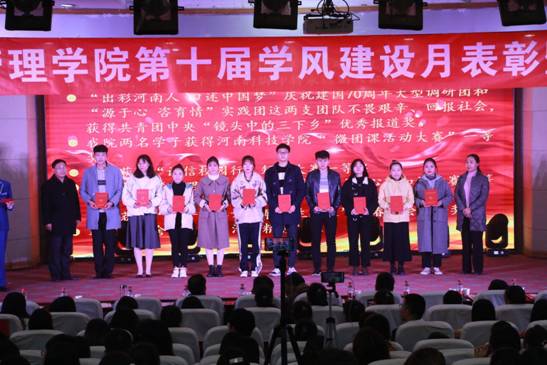 表彰大会现场对我院获得共青团中央“镜头中的三下乡”优秀报道奖的两支团队以及在“全国外贸从业能力大赛”“全国大学生人力资源管理技能大赛”“第十届全国高校市场营销大赛”“全球首届供应链建模大赛”等国家级专业技能竞赛中获奖的学生代表、“微团课大赛”一等奖选手、“诚信校园行”短剧大赛一等奖团队、“心理活动月”演讲比赛及心理知识竞赛一等奖选手和“早读达人”“学习标兵”“英语演讲比赛”中表现优异的学生进行了颁奖,并以此激励广大学生勤奋好学,形成优良学风。