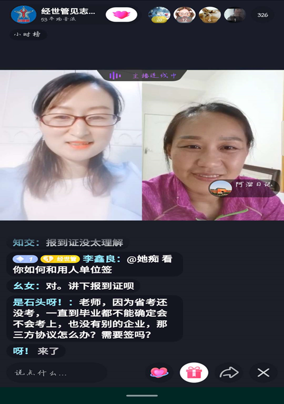 直播分内容讲授和答疑互动两个环节。冯岩围绕“2020年就业形势与政策解读”及“毕业生的就业突破点”等方面切入,深入剖析了当前国家的就业大势与最新就业政策,并从“认清形势、转变观念、主动出击、拓宽渠道”等方面帮助毕业生正确认识当前的就业形势政策,调整就业心态,积极做好就业准备。在答疑环节中,冯岩就三方协议签订、报到证办理、各类专项招考等问题做了详细解读。辅导员老师们也通过弹幕的方式与毕业生进行了实时互动,针对同学们普遍关心的开学时间、毕业实习、毕业答辩等相关问题进行解答。最后,吴丹对本次直播做了总结。她首先传达了学院对于毕业生的关心与支持,表达了与学生共克时艰的坚定决心,并寄语学生要正确面对疫情,把疫情当作考验,主动出击,努力增强就业竞争力,坚定信心,在“疫情大考”的时代命题中交上自己的一份满意答卷。