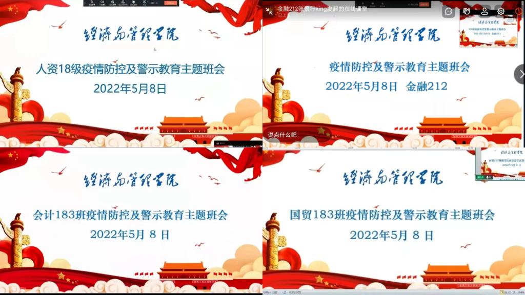 为进一步加强学生疫情防控意识,确保学生的健康安全,5月8日,经济与管理学院组织各班级召开“疫情防控及警示教育”主题班会,学院党委书记何二毛、副书记吴丹等51位教师作为联点班主任,分别深入80个联点班级参加主题班会,覆盖学院全体学生。