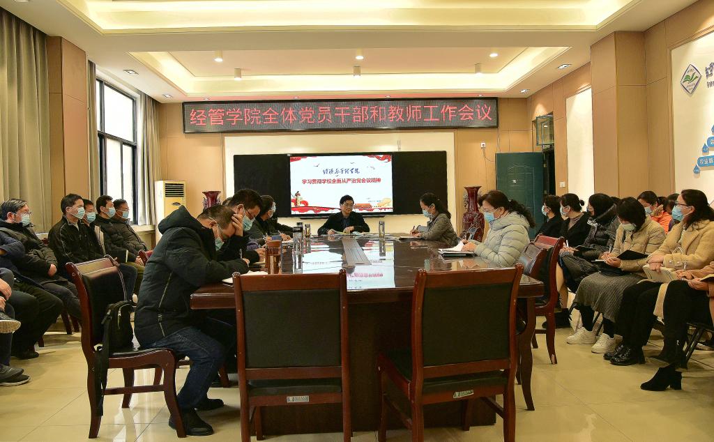3月17日下午,经济与管理学院在10号楼202会议室召开全体党员干部和教师工作会议,传达贯彻学校全面从严治党工作会议精神,学院领导班子及全体教师参加了会议。会议由院党委书记何二毛主持。