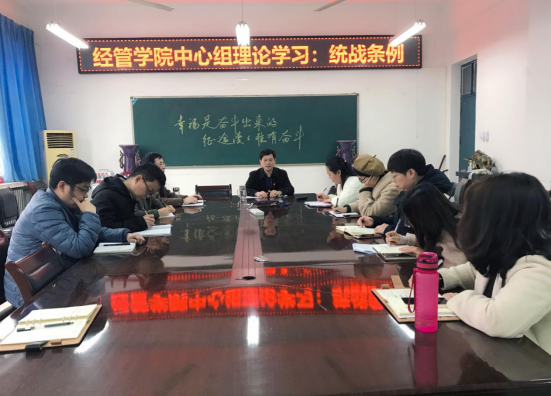 3月18日下午,经济与管理学院党委中心组集中学习研讨了《中国共产党统一战线工作条例》,会议由院党委书记何二毛主持,学院领导班子、科级干部代表及全体辅导员参会。