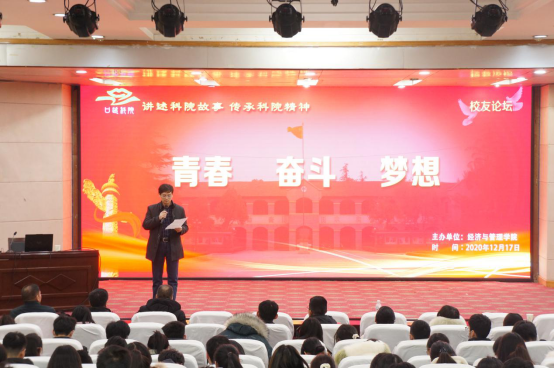 12月17日,经济与管理学院在图教201举办口述科院之校友论坛系列讲座。我院党委书记何二毛、党委副书记吴丹、辅导员和学生代表300余人出席活动。