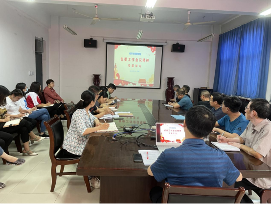 9月23日下午,经济与管理学院在十号楼202会议室举行党委中心组学习会,专题学习省委工作会议精神。学院班子成员、支部书记、各教研室主任参加学习会。会议由党委书记何二毛主持。