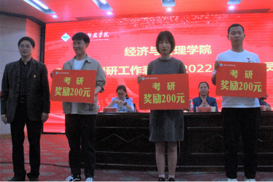 与会领导为考取研究生学生代表颁奖并合影留念。
