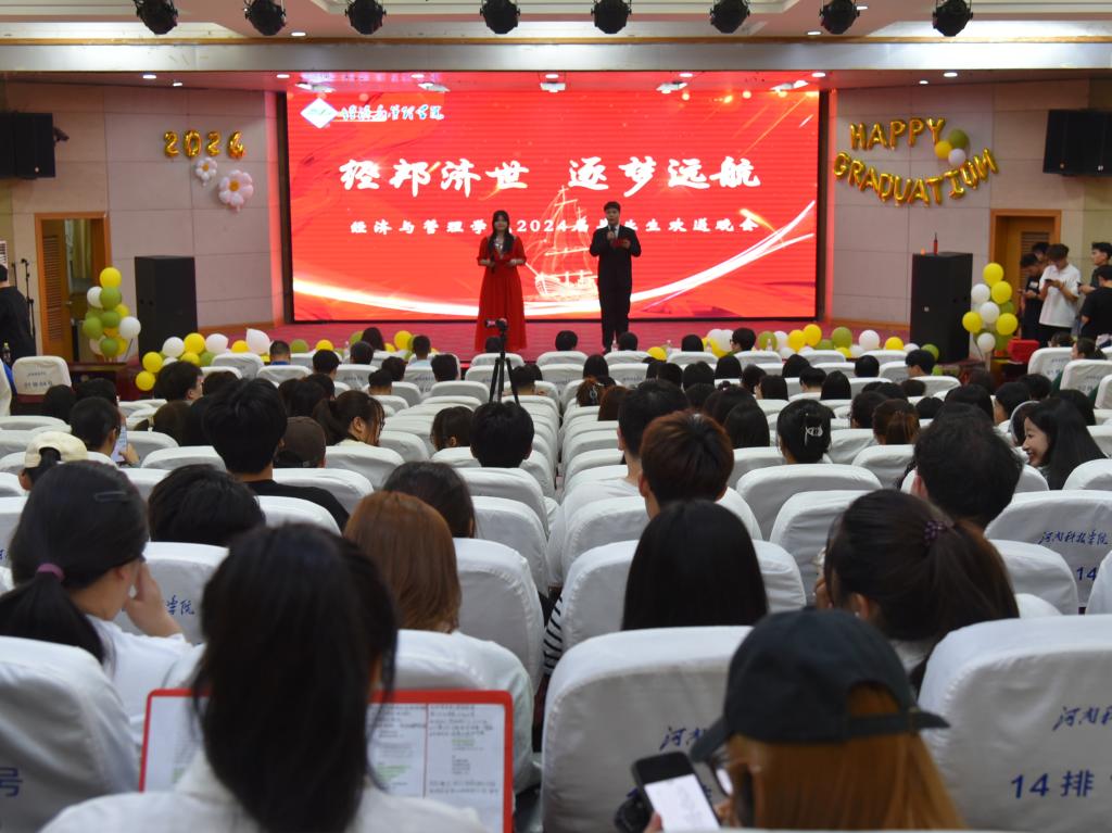 5月30日晚上,经济与管理学院2024届毕业生欢送晚会在图教201会议室隆重举行。经济与管理学院党委书记何二毛、院长崔鸽、党委副书记吴丹、副院长张红岩,全体辅导员及教师代表、学生代表300余人参加晚会。