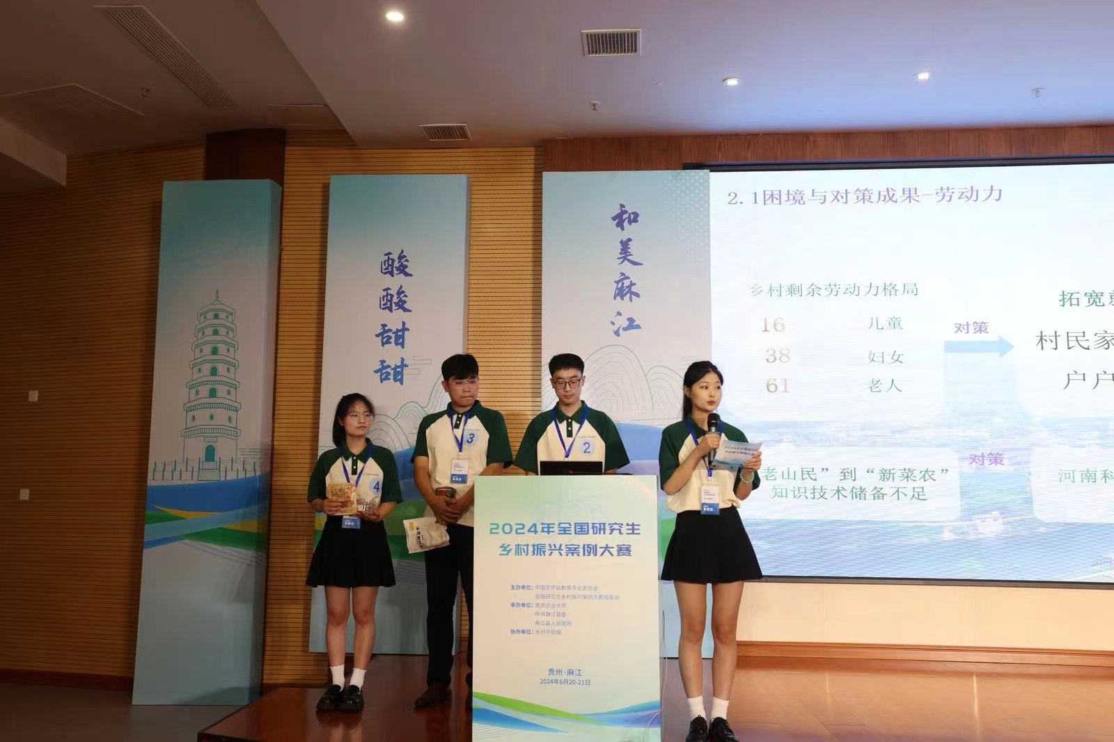 本次大赛共收到全国400多个案例,经过专家评审,有41支代表队进入决赛。我院积极动员研究生组队参赛,让学生聚焦乡村发展中的实际问题,提出切实可行的解决方案。初赛中,有3支队伍在众多参赛团队中脱颖而出,其中“薯”光振兴队进入决赛角逐金银奖,“我与怒江同香伴”队荣获铜奖,“文新茶韵队”荣获入围奖。