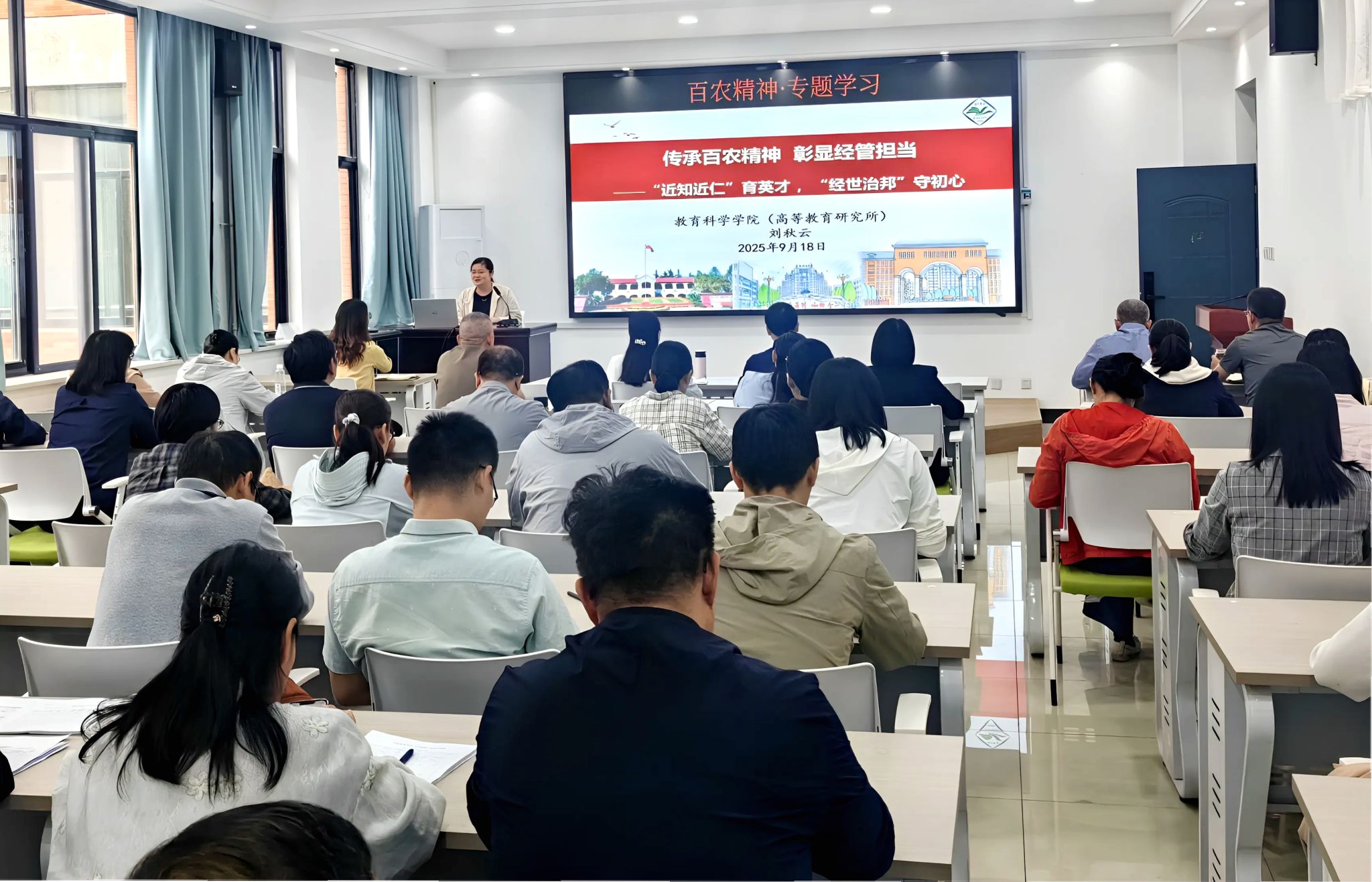 9月18日下午,经济与管理学院在10号楼206会议室举办“百农精神”专题报告会,我校教育科学学院副院长、高等教育研究所副所长刘秋云受邀担任主讲嘉宾,学院全体教师参加会议。报告会由学院党委副书记吴丹主持。