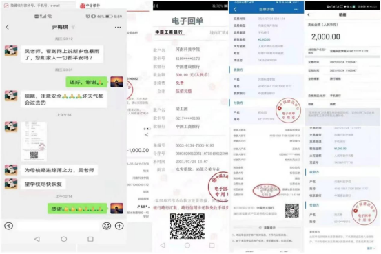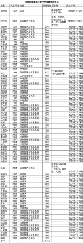 7月24日当天收到捐款47100元,其中经管学院营销04级校友樊金财捐款1万元,信管94级身在新乡灾区的郭立校友为母校抗洪救灾捐款5000元,并且给学校协调了2万编织袋和5台汽油抽水机!公关97级陈建平校友捐款5000元;营销03级尚玉峰校友即使卫辉工厂被淹,损失惨重,看到班级群里的募捐信息,也第一时间为母校抗洪救灾捐款1000元,等等。还有很多校友通过新乡市红十字会等社会渠道陆续捐赠。