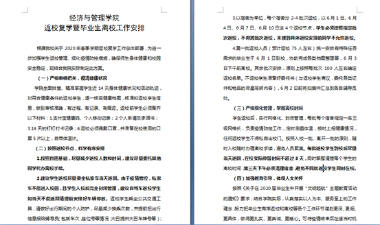 经济与管理学院多次召开党政联席会、全体辅导员会议等,认真落实学校返校安排及工作要求,制定了详细的工作预案,对学生返校安排、复学后学生管理、学院应急工作预案等方面工作进行详细安排,保障复学工作开展平稳有序。前期,学院提前谋划,科学安排毕业答辩、毕业论文材料归档等各项工作,目前线上论文答辩环节已经全部结束,毕业论文材料全部提交电子版,学院统一为学生进行打印装订。