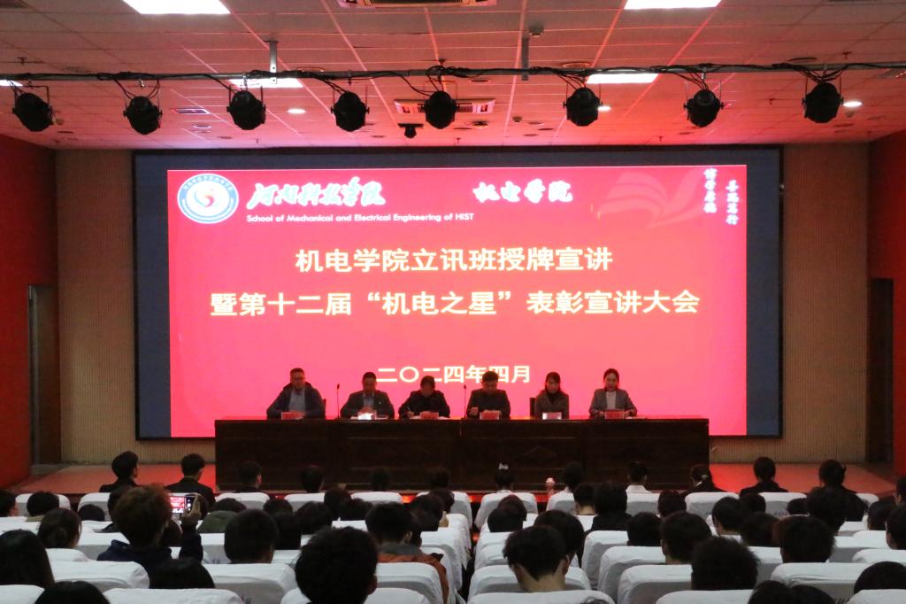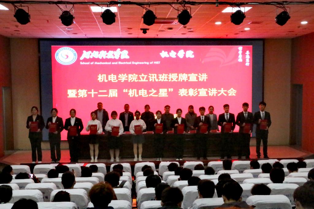 4月2日下午,机电学院立讯班授牌宣讲暨第十二届“机电之星”表彰宣讲报告会在我校图书馆一楼报告厅隆重举行。立讯精密专案部总监赵万纪、学院党政领导班子,学院第十二届“机电之星”获得者以及部分学生代表参加了会议。会议由院团委副书记侯怡主持。