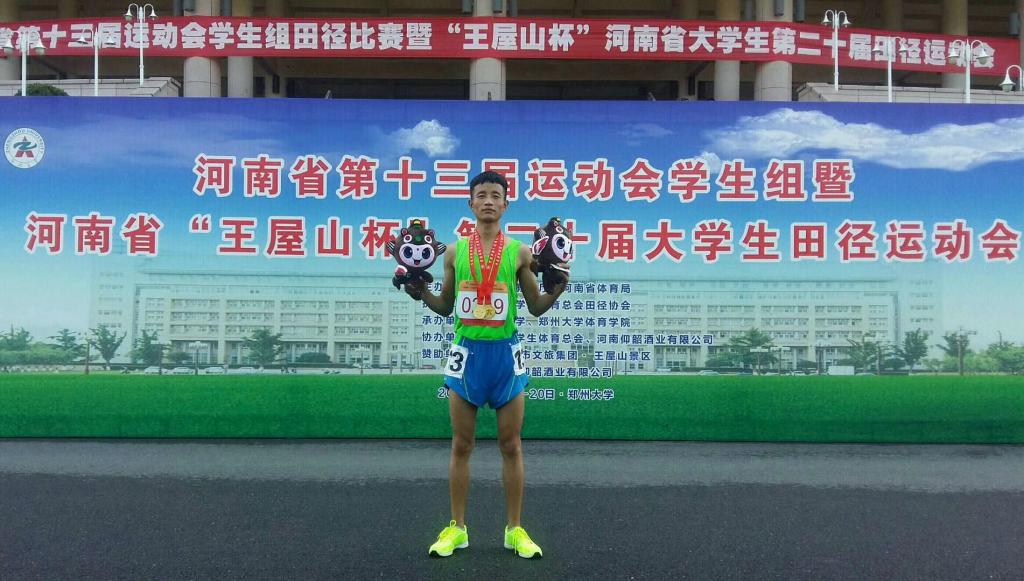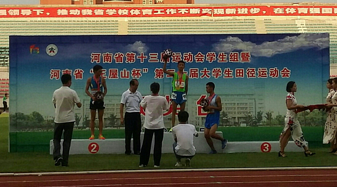7月10日-20日,河南省第十三届运动会学生组田径运动会在郑州大学举行。在河南省第十三届运动会学生组暨河南省“王屋山杯”第二十届大学生田径运动会中,曾天乐同学获得男子甲组3000米径赛金牌、5000米径赛金牌,是我校时隔多年再次获得该赛事金牌,曾天乐同学荣获“优秀运动员”称号。