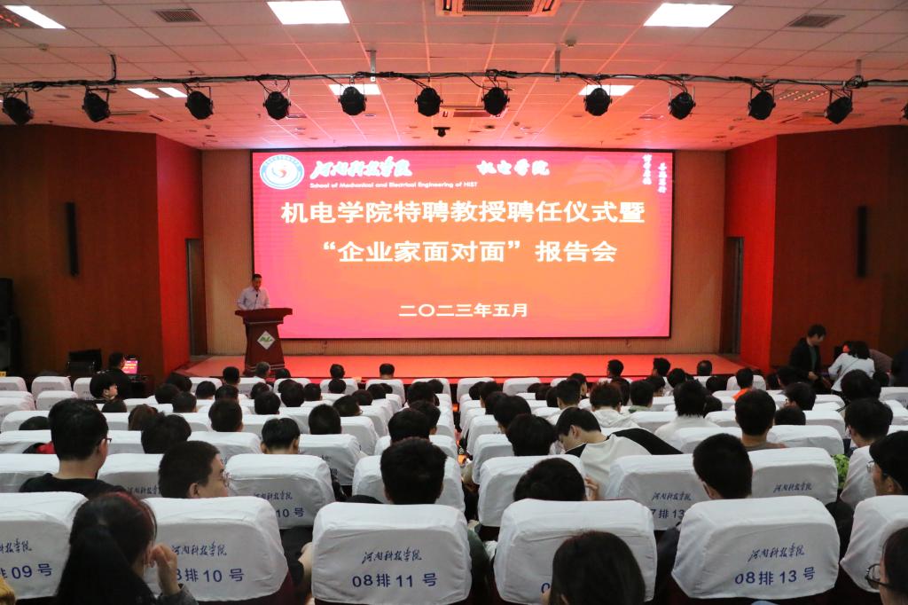 为进一步加强校企合作,深化产教融合,同时激励机电学子明确学习目标、合理规划大学生活。5月10日下午,机电学院在图书馆一楼报告厅举行机电学院特聘教授聘任仪式暨“企业家面对面”报告会,河南四达电力设备股份有限公司董事长兼总经理陈四甫受邀做报告。 校成果转化与合作办公室副主任李勇峰,机电学院党政负责人、教师代表及200余名毕业生参加了报告会。会议由团委书记何涛主持。