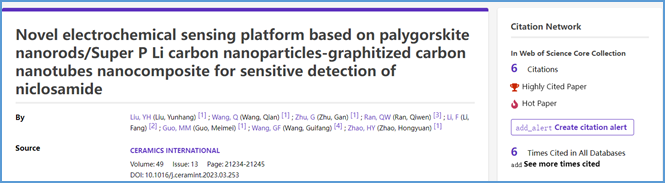 此外,刘云航作为第一作者在《CeramicsInternational》上发表的研究成果“Novelelectrochemical sensing platform based on palygorskite nanorods/Super P Licarbon nanoparticles-graphitized carbon nanotubes nanocomposite for sensitivedetection of niclosamide(2023, 49,21234-21245)”同时入选ESI全球Top 1%高被引论文(ESI Highly CitedPaper)和ESI全球Top 1‰热点论文(ESI Hot Paper)。上述三篇高水平SCI论文均以河南科技学院为第一署名单位,体现了我院研究生培养质量的显著提升。我院高度重视研究生培养工作,着力于人才培养质量提升,注重挖掘研究生潜能,以科研促教学凝聚师生科研力量,取得了一系列高影响力的师生合作学术成果。今后,我院将进一步加强研究生教育改革创新工作,推动学科建设水平再上新台阶。