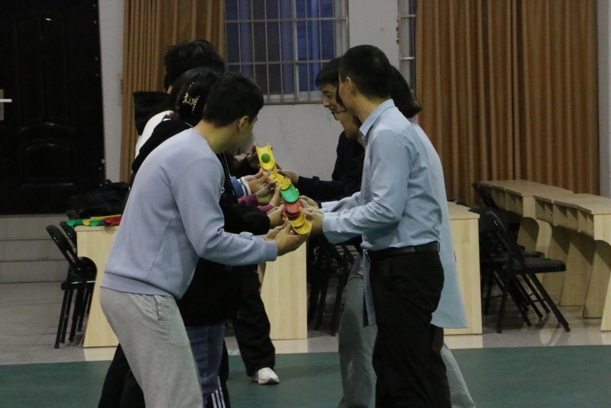 在团委学生会主席郭梦杰的主持下,系列活动有序开始。先后进行了“动名词接力”,“能量传输”,“不倒森林”,“解开千千结”等活动,每个成员都积极参与,集思广智,现场的气氛紧张而又欢快,呈现一片欢声笑语。活动需要智慧,更需要团结协作,在活动中大家体会到了团队的力量,也培养了协作精神。