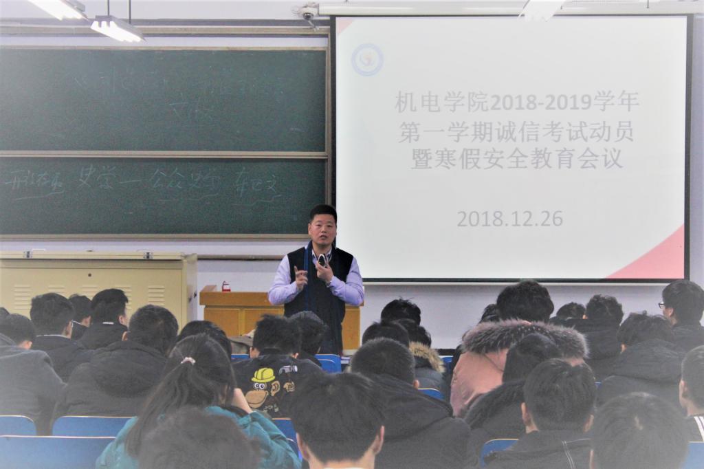 为严肃考风考纪,营造诚信考试氛围,增强学生安全防范意识,保证学生度过一个安全的假期,12月26日至27日,机电学院在五合一、四合二、三合二、零合一、零合三教室分6场分别为16级、17级和18级共计1550余名学生召开了期末诚信考试动员暨寒假安全教育会议。机电学院党委副书记李印,辅导员申冲、郭小月、孟书广分别出席并主持会议。