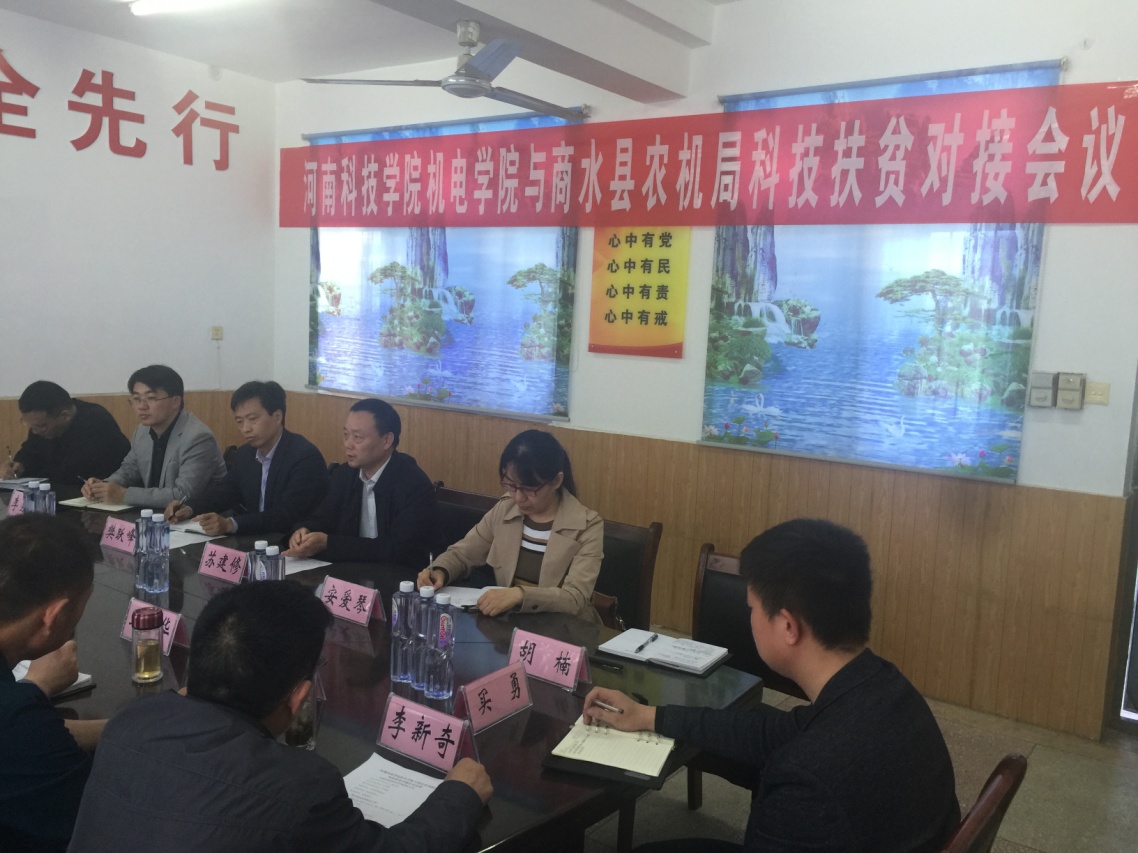 会上,商水县农机局党组书记、局长张福来介绍了本县制造业发展现状,重点介绍了本县农机推广应用情况以及相应技术需求;机电学院院长苏建修向商水县与会人员详细介绍了机电学院的概况、办学优势、农机特色、对接打算等;学校驻商水县扶贫联络员、校资产经营管理有限公司副总经理王锐就如何开展好扶贫对接提出了切实可行的意见建议。随后,与会人员就农机改造升级、秸秆综合利用、农机维护、技术人员培训等进行了深入交流,并且双方就新型智能化农机推广试验站建设进行了详细商讨,并达成了初步帮扶意向。