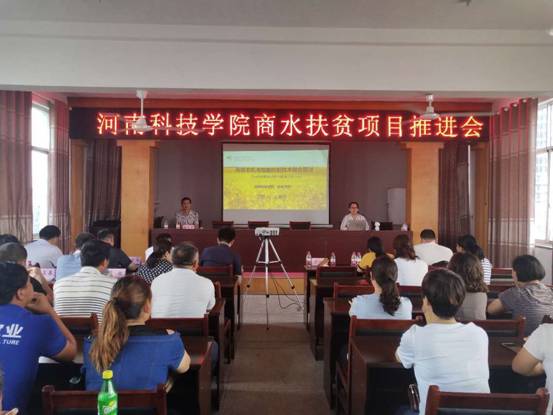 在学校驻商水县扶贫联络员、校资产经营管理有限公司副总经理王锐的陪同下,帮扶组来到商水县农机局,由商水县农机局副局长王明贵主持召开了“扶贫项目推进会”。各乡镇合作社技术人员、农业种植大户等40余人参加了会议。