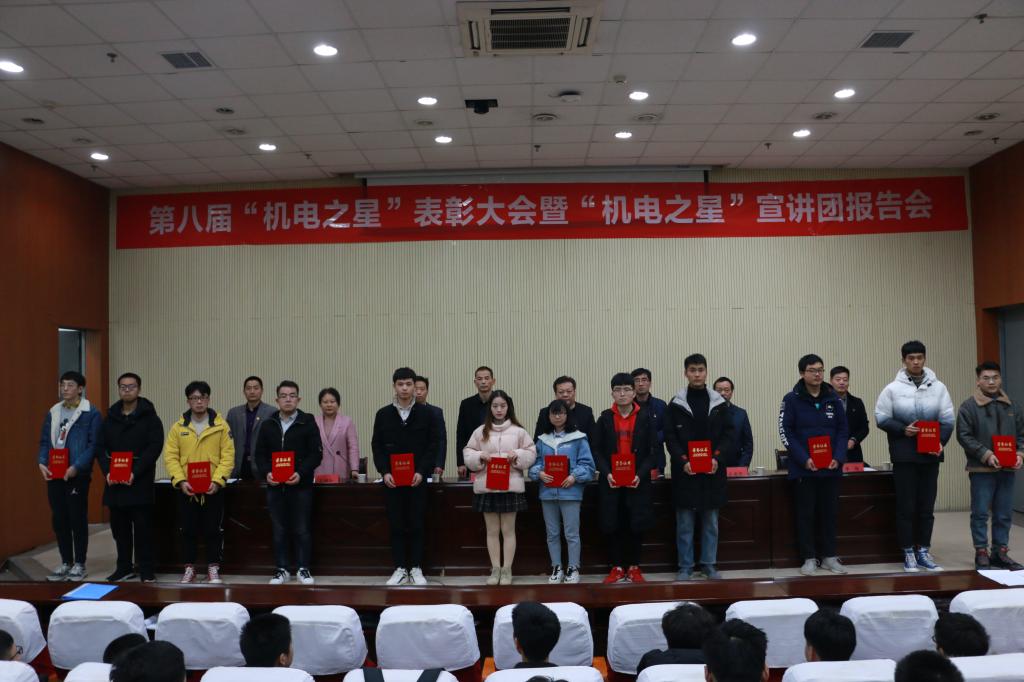 会议首先由机电学院副院长孔晓红宣读《关于表彰机电学院第八届“机电之星”的决定》。学院学生工作领导小组通过德、能、勤、绩四个方面考核,经个人申报、网络投票、民主推荐、团委审核以及机电学院党政联席会议研究决定等程序,在候选人中评选出赵辉等12名同学为第八届“机电之星”。随后,出席大会的领导为受表彰的“机电之星”颁发证书,并合影留念。