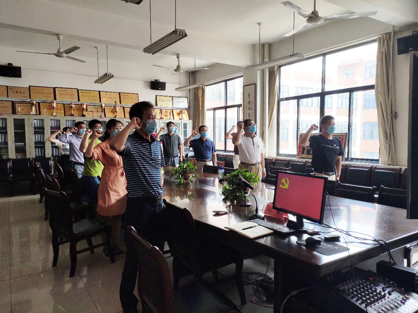 会议之初,全体教工党员面向党旗重温了入党誓词。
