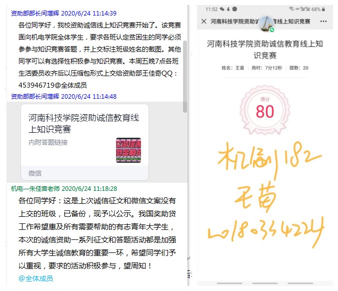 为了营造优良的育人环境、普及助学贷款知识,6月24日起,应我校学生处要求,我院资助部学生干部联合各班生活委员,组织全院学生进行“诚信校园行”资助知识线上答题,宣传学生资助政策、普及金融、诚信基础等相关知识,使广大学生全面接受诚信知识教育,形成以诚信为荣的良好校园氛围。本次线上知识竞赛时间自6月24日至6月26日,历时三天。共计1300人次参与,同学们纷纷在朋友圈、QQ全晒出自己的成绩单。