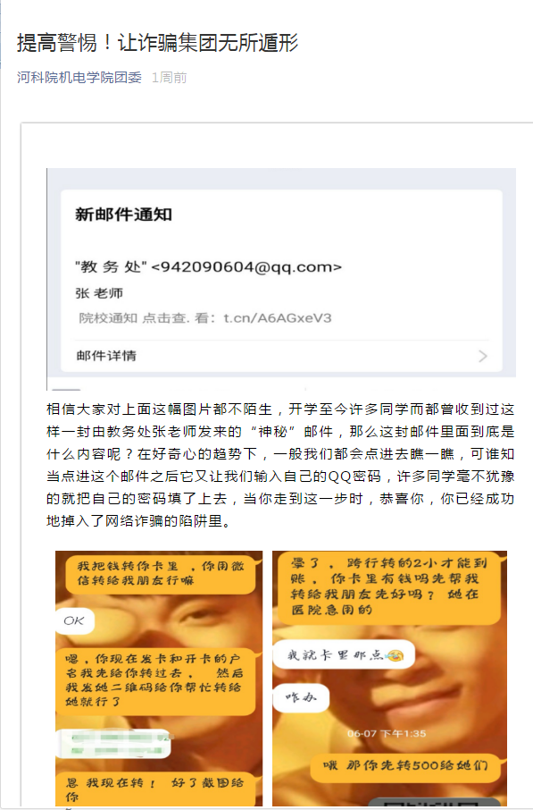 自6月17日至6月23日,我院积极响应动科学院举办的“树立诚信观念·防范金融风险”微信文案比赛,历时一周。由我院新闻中心成员发出号召,各班班委会带领本班同学积极制作微信文案,参加院系复赛。在各班委会的积极宣传下,全院学生热情高涨,微信文案内容健康丰富,形式多样,全部围绕大学生之事,体现出当代大学生积极向上的世界观、人生观,价值观。团委共收到36篇微信文案。机电学院团委四位辅导员老师及新闻中心学生干部组成复赛评审团。优中选优推选出1篇内容充实,形式新颖,价值观积极正面的微信文案发表在我院微信公众号平台上进行宣传。该篇题为《让诈骗无所遁形》的微信文案,是来自电气191班的周可、康培森、张中显团队。该文案内容坚持原创,全部来源于当下大学生曾经遇到或者的各种诈骗形式,深入简出,说服力强,阅读量上千次,最终在校级决赛中荣获三等奖的好成绩。