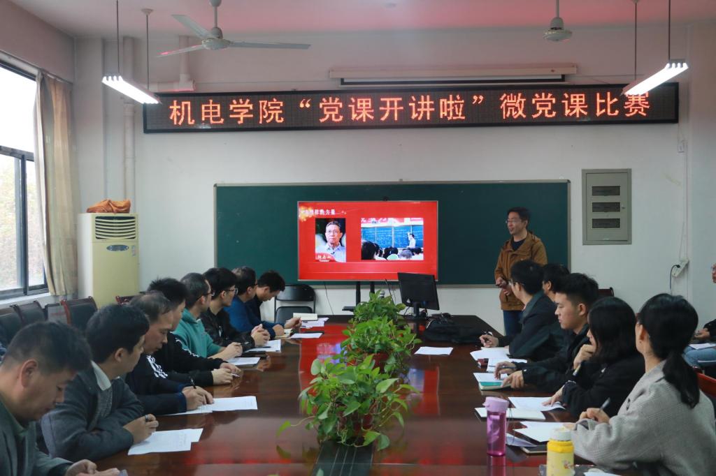为深入学习贯彻习近平新时代中国特色社会主义思想,巩固拓展“不忘初心、牢记使命”主题教育成果,加强和改进党员经常性教育,不断丰富党员教育体系内容,增强党员教育的针对性和有效性。根据校党委组织部关于组织开展“党课开讲啦”活动有关通知要求,机电学院“党课开讲啦”微党课比赛于10月29日下午在4304会议室顺利进行。机电学院党政领导班子、全体党员全程参加。