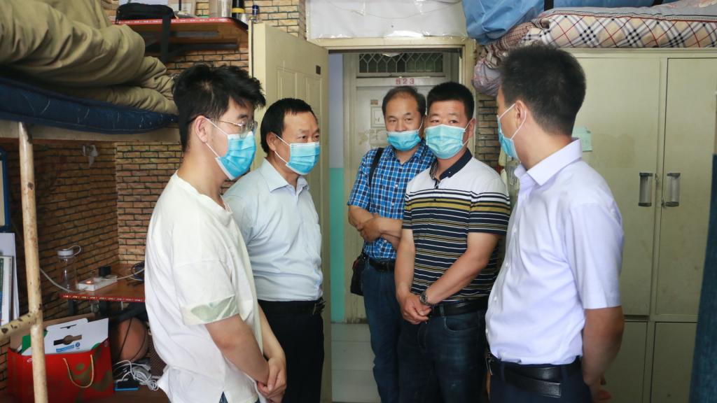 为进一步贯彻落实学校返校复学相关文件精神,了解学生返校情况并做好疫情防控工作。5月21日上午,机电学院党政领导、毕业论文指导老师和辅导员一行5人到1号学生宿舍楼524宿舍看望第一批返校复学的毕业生机制中外164班刘浩同学。