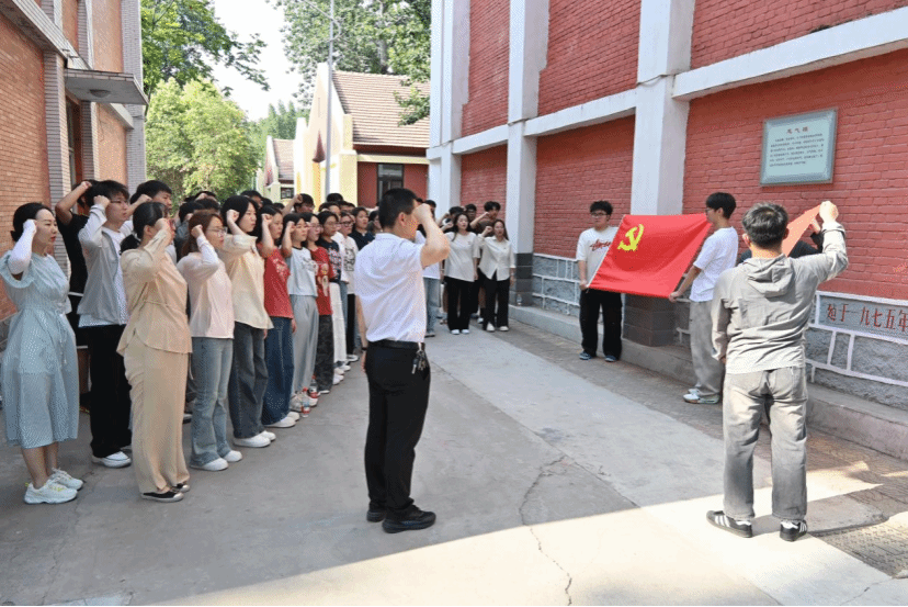 入党宣誓仪式在志气楼前庄严举行。仪式上,张雅凌、何涛、侯怡为42名新党员逐一佩戴党员徽章。随后,何涛带领全体新党员面向党旗庄严宣誓:“我志愿加入中国共产党……”铿锵有力的誓言在志气楼前回荡,新党员们以坚定的目光和洪亮的声音,表达了对党忠诚、为共产主义事业奋斗终身的决心。