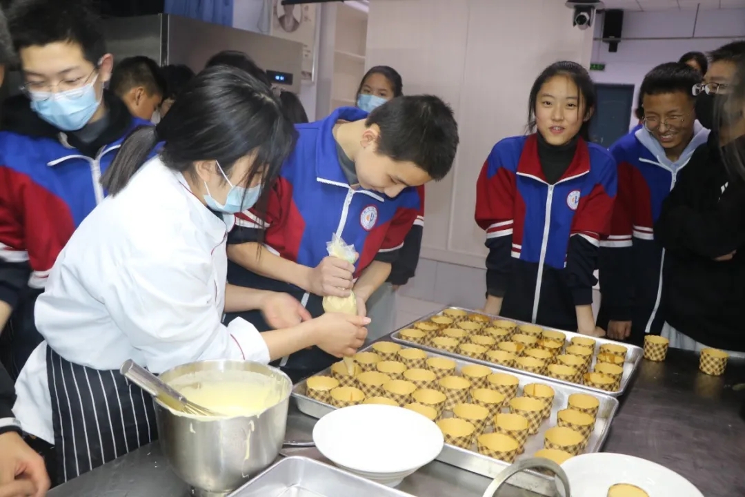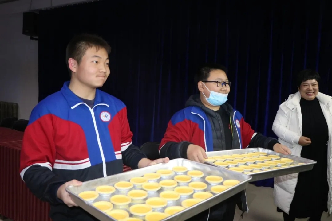活动中,刘志远老师为学生们详细的讲解了制作蛋挞、无水面包的前期准备、选材、制作流程以及制作中应注意事项,再配合称重、配料、打蛋、搅拌一直到进烤箱烤做了现场示范。在制作过程中,学生们积极踊跃,纷纷展示了自己的“十八般武艺”。15分钟后,浓郁的蛋挞、面包香味弥漫了整间屋子。学生们在品尝了自己亲手制作的蛋挞和无水面包后,脸上纷纷洋溢着快乐幸福的笑容。